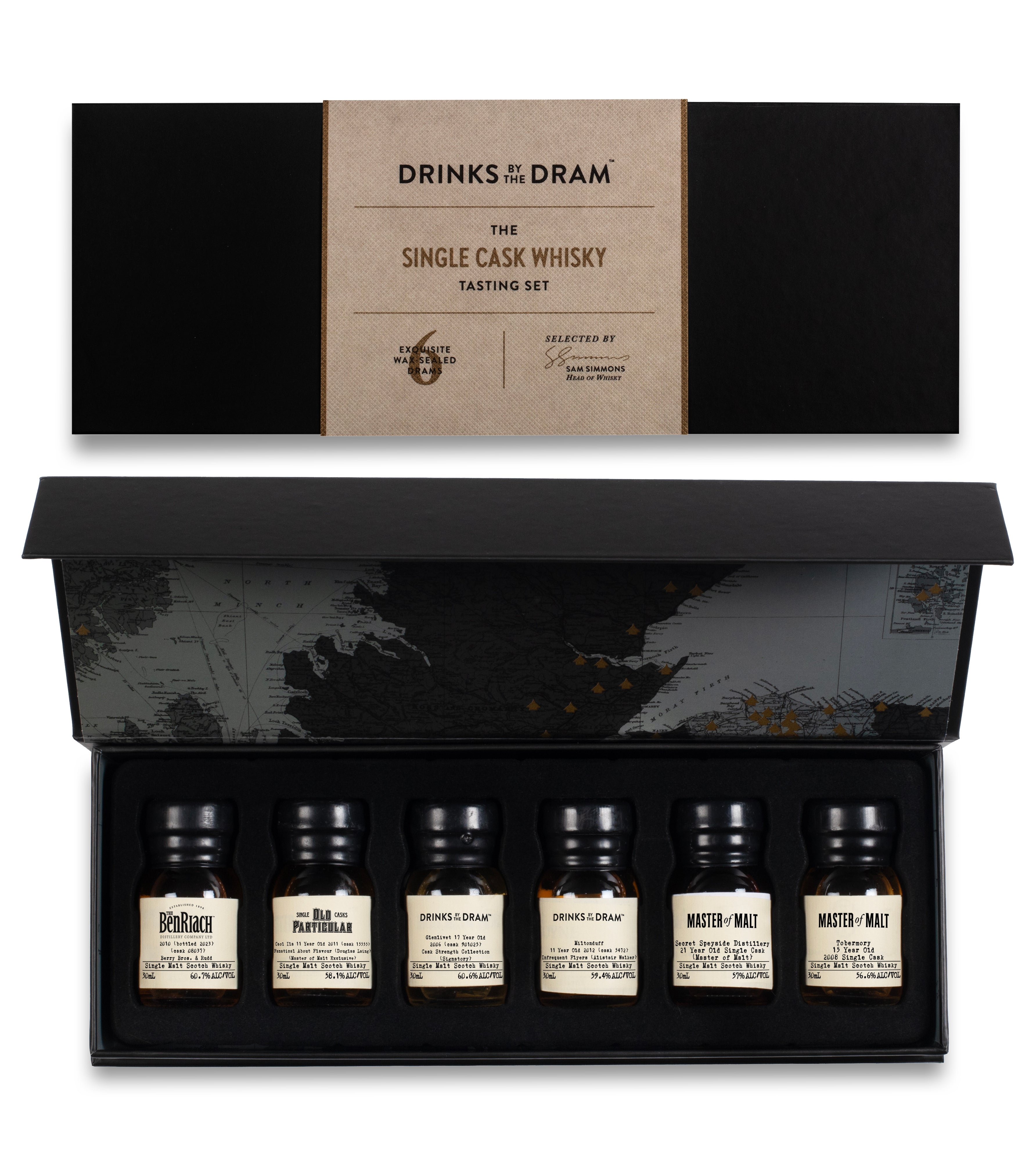 Discover an exceptional collection of six 30ml wax-sealed drams, each showcasing extraordinary whisky from renowned distilleries and producers around the globe. Every whisky in this set is drawn from a single cask, ensuring a one-of-a-kind tasting experience that can never be replicated.